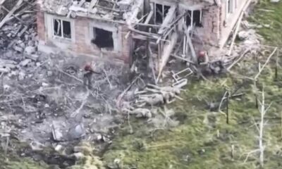 Снимките од воздух покажуваат како четворица украински војници излегуваат од уништена куќа, едниот со кренати раце во знак на предавање, а потоа легнат со лицето надолу...