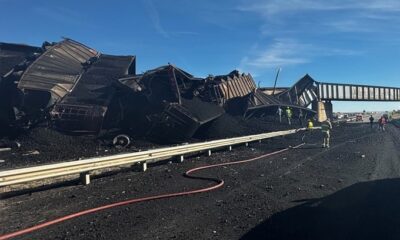 Возач на камион загина кога воз излета од шините и урна мост, истури јаглен и оштети шински вагони преку автопат во близина на Пуебло, Колорадо, соопштија...