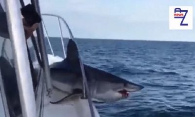 Џиновска ајкула скокна од морето и се заглави на оградата на брод на Лонг Ајленд. На видеото се гледа како ајкулата се обидува да се врати...
