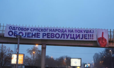 На неколку места во Белград се појавија транспаренти со натпис „Одговорот на српскиот народ на обидот за обоена револуција“ заедно со илустрација на црвена рака, на...