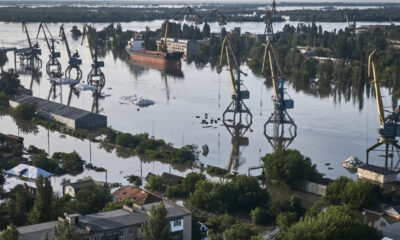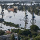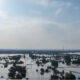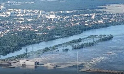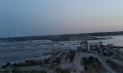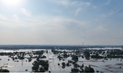 Новинари и украински функционери споделуваат видео снимено со дрон на социјалните мрежи, на кое се гледа поплавениот град Олешки на левиот брег на реките Днепар, во...