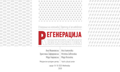 Ликовната изложба „Регенерација“, на авторките Ана Ивановска, Христина Зафировска и Маја Кировска, ќе биде отворена в среда, 18 октомври 2023, во 20 часот, во галеријата на...