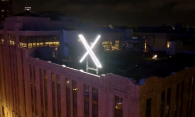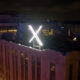 Блеска новото лого на „Твитер“, Х, на зградата во Сан Франциско, од каде што милијардерот Илон Маск планира да ја води компанијата. Луѓето што живеат во...