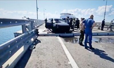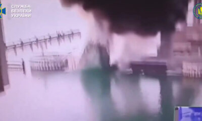 Украинската безбедносна служба (СБУ) објави дека го оштетила Кримскиот мост со подводни експлозиви. Украинското разузнавање, исто така, сподели видео на кое се гледа експлозијата. „Подводните потпори...