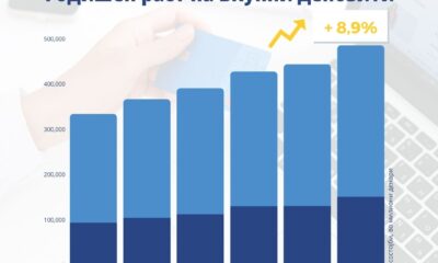 Анализирано на годишно ниво, вкупните депозити се зголемени 8,9 % како резултат на зголемувањето на депозитите на двата сектора, со малку поголем придонес на секторот домаќинства,...
