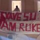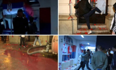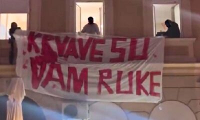 Активисти на Движењето на слободните граѓани синоќа на големо бело платно на Градското собрание во Нови Сад закачија транспарент на кој со црвена боја беше испишано...