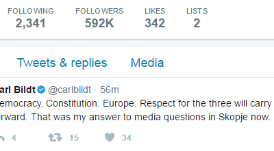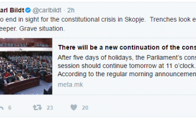 Поранешниот шведски премиер и министер за надворешни работи Карл Билд на својот Твитер профил најави дека доаѓа во Македонија. „На турнеја за кризата во Скопје...