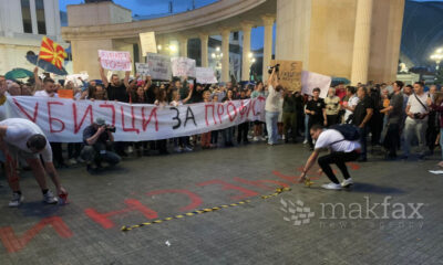 Во стилот на шарена револуција, демонстрантите на асфалтот пред Влада со црвена боја испишаа убијци и оставија отпечатоци од дланки. „Убијци“, крадци“ , „оставки“ се скандира...