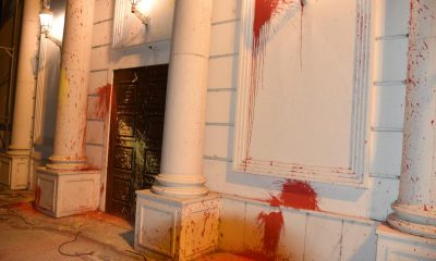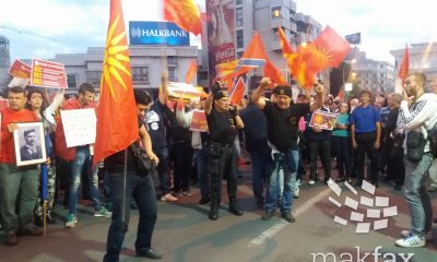 Штабот на ВМРО-ДПМНЕ е офарбан со црвена и жолта боја за време на протестот пред Собрание кој се одржа вечерва против промена на државното име. Според...