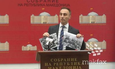 Пратеникот на ДУИ, Артан Груби, покажувајќи фотографии на кои се гледа Антонио Милошоски како протестира во 1997 година против изучување на албанскиот јазик на Педагошкиот факултет,...