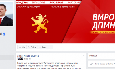 Лидерот на ВМРО-ДПМНЕ, Никола Груевски повторно се огласи на фејсбук. Според него „влада која ќе ја спроведува Tиранската платформа направена и оформена во друга држава,...
