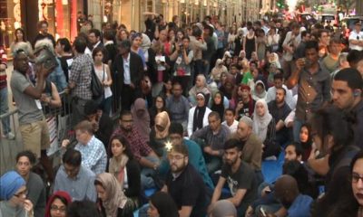 Стотина Муслимани се собраа на ифтар, вечерен оброк во текот на исламскиот месец Рамазан, пред кулата Трамп во Њујорк во знак на протест против, како што велат тие, исламофобската...