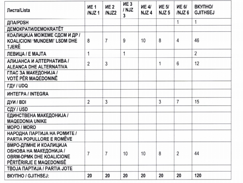 Коалицијата на СДСМ освои 46 мандати, а коалицијата на ВМРО-ДПМНЕ освои 44, според податоците што ги објави Државната изборна комисија на попладневната седница по вчерашните предвремени парламентарни избори.