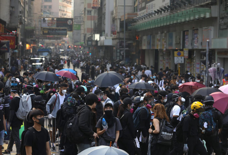 „Ројтерс“ цитираше сведоци дека некои демонстранти имале изгореници од хемикалии од водените топови, испукани од полицијата. Како што објави локалниот РТК, многу луѓе биле уапсени во близина на универзитетот додека активисти запреле сообраќај во блиската трговска област Натан Роуд и ги принудиле сопствениците да ги затворат трговските центри и продавници.