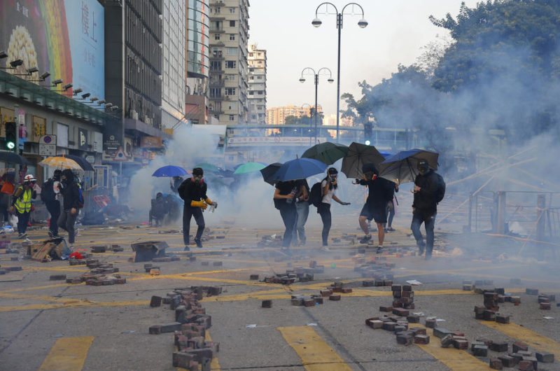 Полицијата во Хонг Конг употреби солзавец и гумени куршуми за да приведе стотици антивладини демонстранти кои се обидоа да излезат од универзитетскиот кампус. Десетици демонстранти се обидоа да избегаат од кампусот по ноќта полна со насилство во полуавтономната кинеска територија, откако беа блокирани поголемите патишта, еден мост беше запален и еден полицаец беше погоден со стрела. 38 лица се повредени, соопшти Градскиот здравствен оддел.