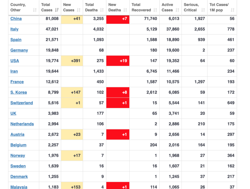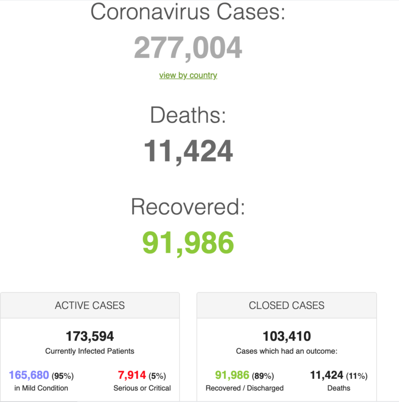 Вкупната бројка на заболени од коронавирусот во светот утрово се искачи над 277 илјади лица.Голем скок во новопријавени случаи вчера имаше во Германија каде вкупната бројка скокна за неколку илјади и таму сега речиси 20.000 лица се регистритрирани како позитивни на Ковид -19.