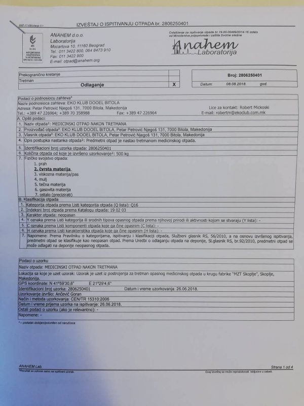 „ТДС ‘Екоклуб’ ДООЕЛ Битола – подружница Скопје Автоклав за дезинфекција на медицински отпад, во кругот на МЗТ- Скопје, постапиле по решението државен инспекторат за животна средина бр. 11-46 од 6.02.2018 година на 9.02.2018 година, извршиле мерење на концентрации на загадувачки супстанци од емитер (вентилациски испуст) на 23.02.2018 од процесот на дезинфекција и пресување на медицински отпад со помош на електрична енергија и вода на температура од 160 степени Целзиусови и притисок на пареа од 5 бариили 0,5 мегапаскали (?). Мерењето е извршено од компетентна лабораторија при што е изготвен лабораториски извештај од тестирање“, пишува во записникот.