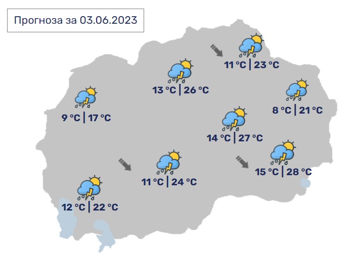 Времето денеска претпладне ќе биде сончево со мала до умерена облачност. Од пладне на повеќе места ќе биде нестабилно со пороен дожд, грмежи и засилен ветер. Локално процесите ќе бидат поинтензивни во форма на невреме со интензивен пороен дожд, силен ветер, електрични празнења и изолирана појава на град, информираат од УХМР.