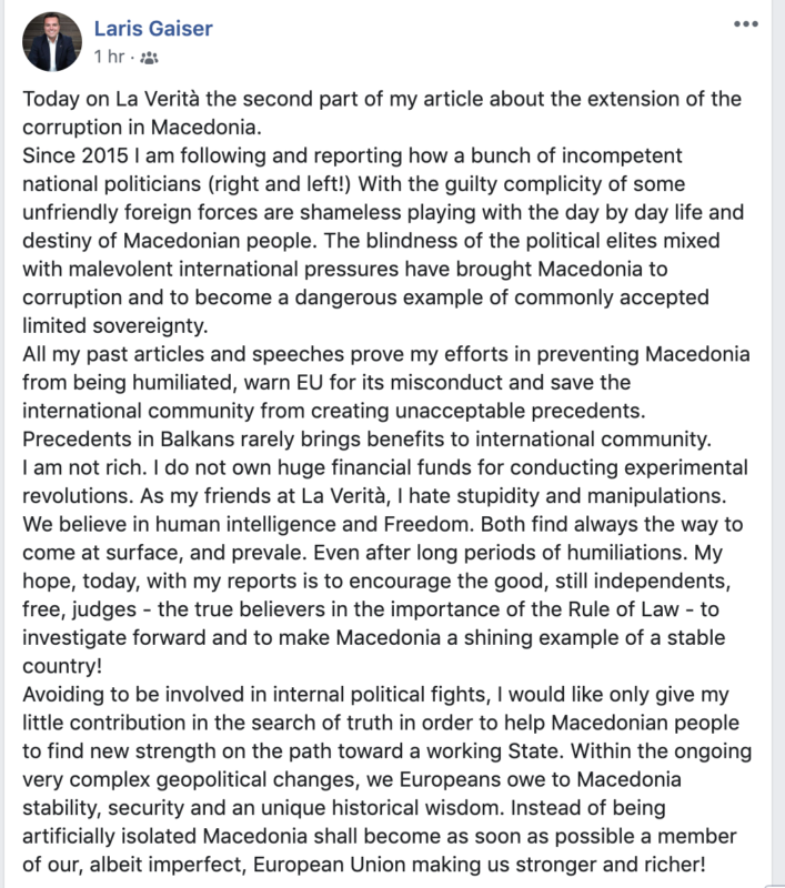Гајсер најави дека во италијанскиот весник „Ла верита“ ќе објави серија снимки поврзани со корупцијата во земјава. На втората аудио-видеоснимка може да се слушне разговорот меѓу Бојан Јовановски, познат како Боки 13, и бизнисменот Орце Камчев, но се слуша и гласот на специјалната јавна обвинителка во оставка Катица Јанева.