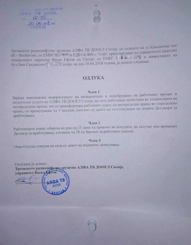 „Заради максимална искористеност на капацитетите и подобрување на работниот процес и медиумски услуги во „Алфа ТВ“ ДООЕЛ Скопје, на сите работници вработени во телевизијата на неопределено работно време им се трансформира работниот однос од неопределено време во определено, со времетраење од 3 месеци, сметано од денот на потпишување на новите договори за вработување, стои во одлуката потпишана од новоименуваниот управител на Телевизијата“, Васко Ефтов.