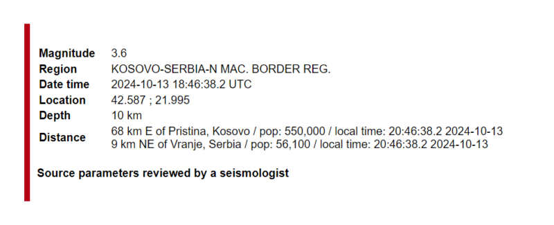 Според информациите на ЕМСЦ земјотресот се случил на длабочина од 10 километри, на 9 километри од Врање.
