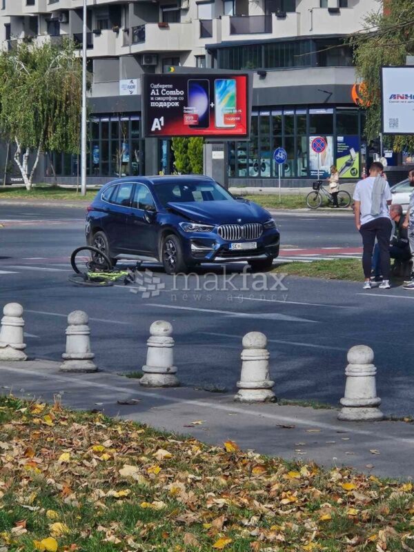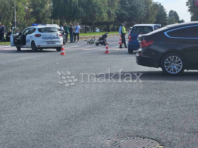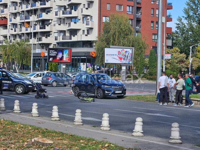 На пешачкиот премин, е оставен автомобил „бмв“ со скопски таблички, паднат велосипед и празна количка за бебе.