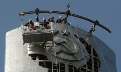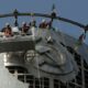 Советскиот национален грб е отстранет од споменикот на Татковината што се издига над украинскиот главен град Киев. На снимката се гледаат работници кои го отстрануваат симболот...