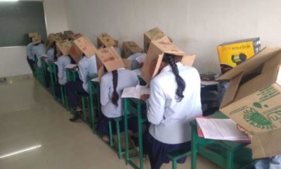 Индиските студенти носат кутии на главите за време на испитот за да спречат измама. Вакви фотографии се појавија во јавноста по што училиште во Индија се...