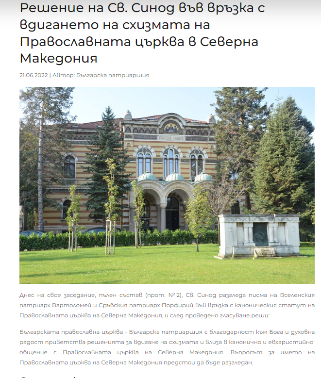 „Бугарската патријаршија со благодарност кон Бога и духовна радост ги поздравува одлуките за подигање на расколот и стапува во канонско и евхаристиско заедништво со Православната црква на Северна Македонија. Останува да се разгледа името на православната црква во Северна Македонија“, велат од бугарската патријаршија.