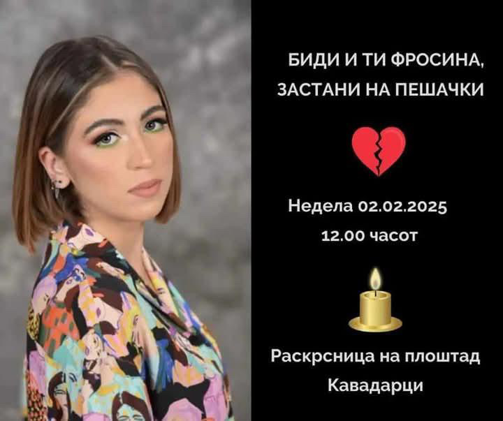 Утре точно на пладне се организира протестен собир во Кавадарци за да се оддаде почит нa Фросина Кулакова од Неготино, која беше прегазена додека поминуваше пешачки премин на булеварот „Партизански одреди“ во близина на Универзалната сала во Скопје.