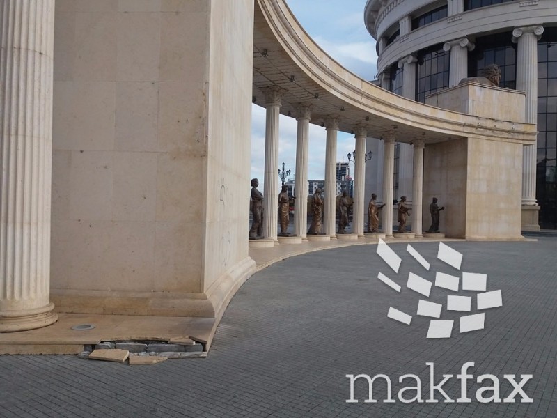 Втор месец стои искршена колонадата „Независна Македонија“ на плоштадот Мајка Тереза пред Македонската опера и балет. Искршен е дел од плочките, а парчињата стојат расфрлани покрај колонадата. Град Скопје, во чија надлежност е одржувањето на спомениците од проектот „Скопје 2014“, вели дека за состојбата редовно ја информираат фирмата ангажирана за одржување на спомениците.