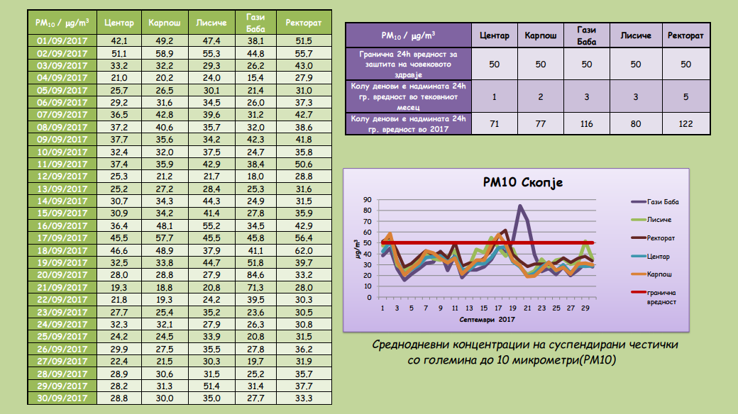 Според извештајот кој го мери квалитетот на воздухот, во септември три дена концентрациите на штетните честички биле надминати во Гази Баба и Лисиче, два дена во Центар и еден ден во Центар. На мерната станица кај ректоратот, надминувањето на дневната концентрација со PM10 честичките било за 5 дена.