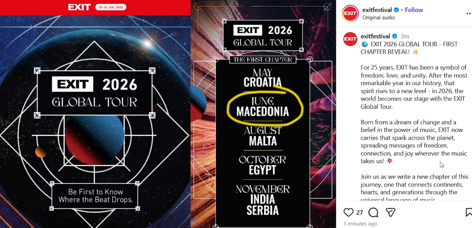 Според објавата на официјалниот Инстаграм профил на EXIT, првите дестинации за 2026 Exit Global Tour година се Египет, Индија, Малта, Хрватска, Македонија и Србија.