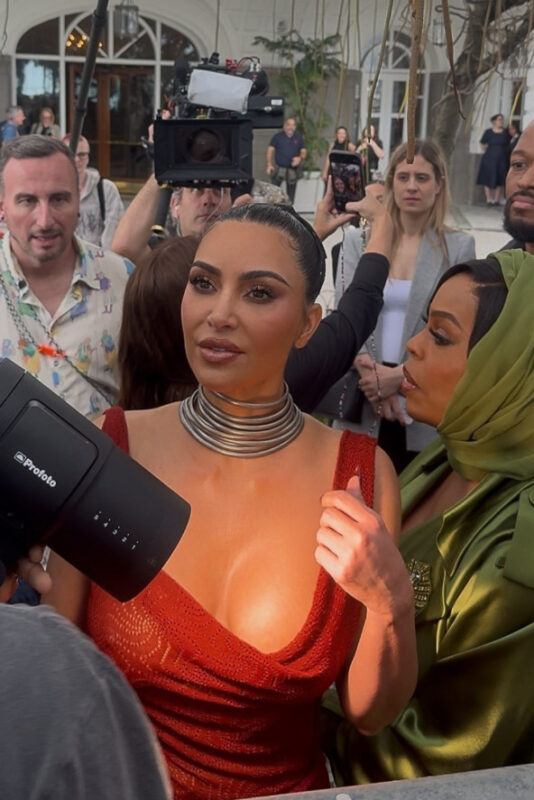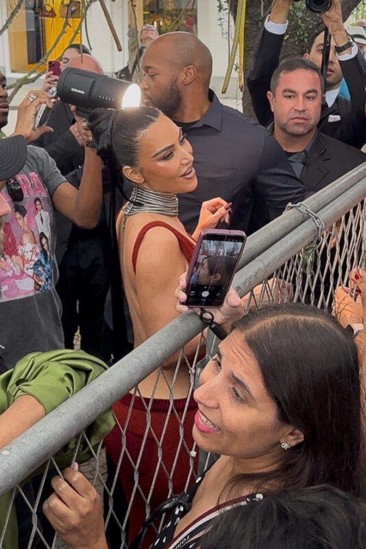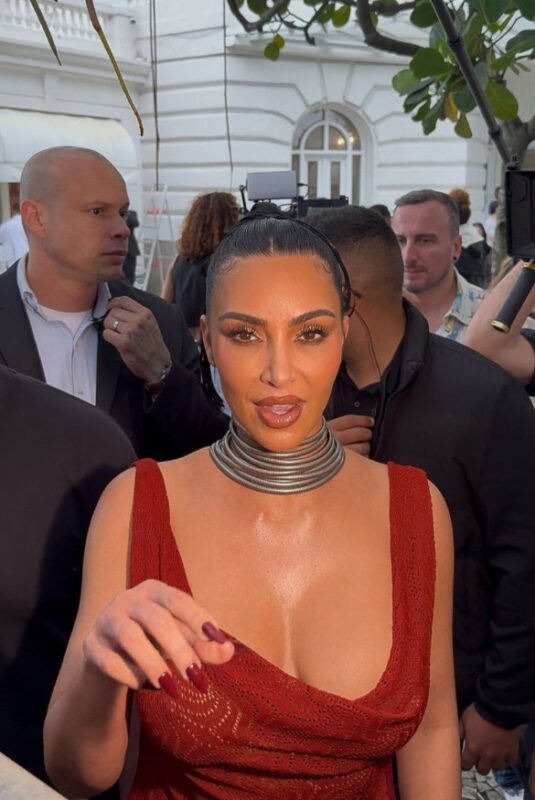 Кардашијан избра црвен лежерен фустан кој малку паѓа преку градите и открива премногу. Како и обично, Ким сè украси со детали, па имаше низа сребрени ѓердани околу вратот слични на популарните чокери, додека косата ѝ беше собрана назад и врзана во пунџа.