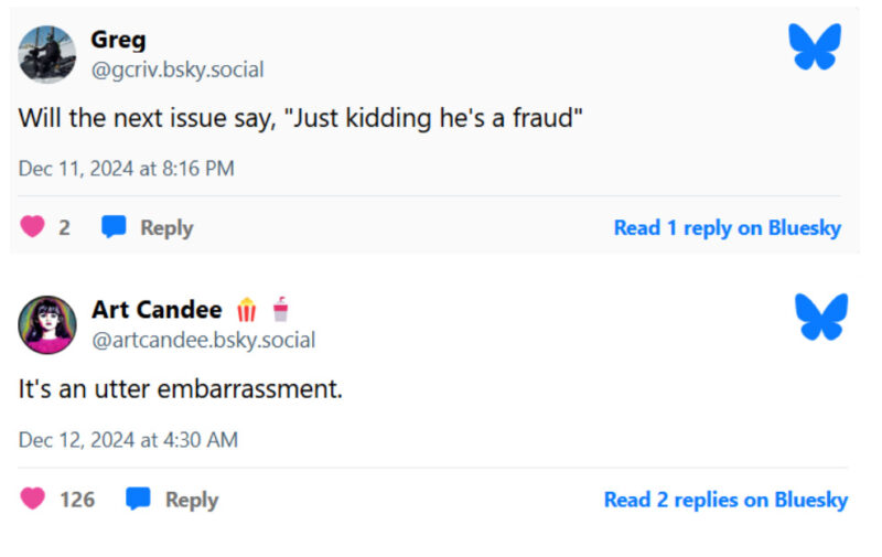 Дали во следниот број ќе пишува: „Се шегуваме, тој е измамник?“, напиша некој на социјалната мрежа Блускај. „Треба да пишува најлудата личност на годината“, додаде некој, а потоа друг корисник на социјалните мрежи напиша: „Ова е срамно“.