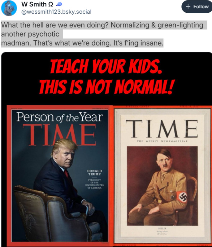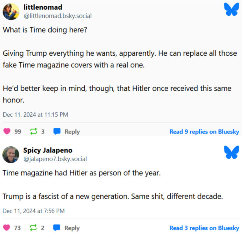Во коментарите, многу луѓе се потсетија на далечната 1938 година, кога Адолф Хитлер исто така беше избран за личност на годината и ја споредија титулата на Трамп оваа година со него. „Што прави Тајм? Подобро да има на ум дека Хитлер еднаш ја доби истата чест“, „Магазинот Тајм исто така го прогласи Хитлер за личност на годината. Трамп е фашист од новата генерација“, коментираат тие.