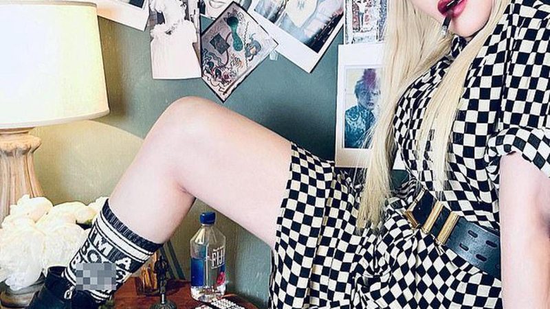 Кралицата на поп-музиката (62) на себе има црно-бел кариран фустан, сугестивни чорапи, војнички чизми и мачкести очила.