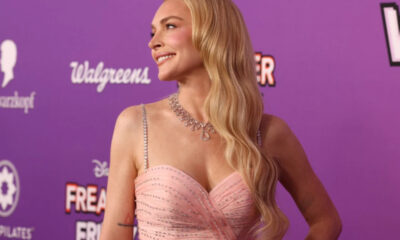 Наместо портокаловата коса по која беше позната долго време, Линдзи се одлучи за елегантни руси локни. Таа носеше бел фустан со цветен дезен, кој го искомбинира со крем капут со златни копчиња и чанта во иста боја.