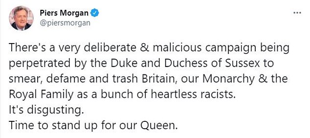 „Војводата и војвотката од Сасекс вршат многу смислена и злонамерна кампања да ги оцрнат, осрамотат и уништат Велика Британија, нашата монархија и кралското семејство како куп бездушни расисти. Одвратно е“, напиша Морган во твитот повторно насочувајќи се против парот.
