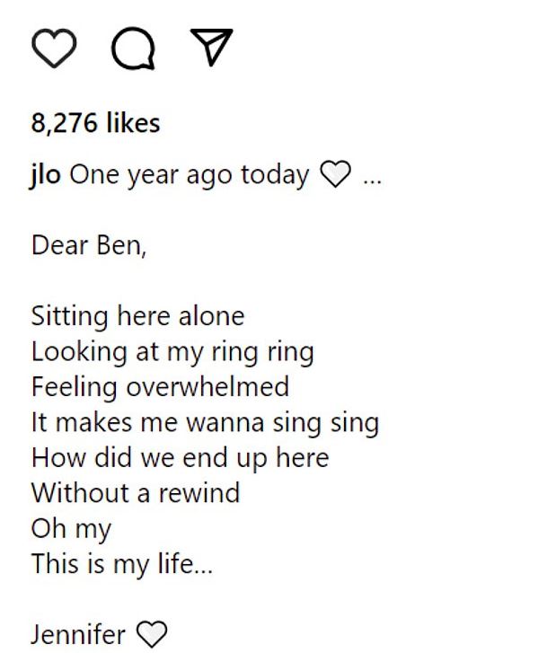 Џенифер (54), која глумеше невеста во девет филма, своите 394,3 милиони следачи на социјални мрежи ги почести со неколку стихови од претстојнат песна „Драг Бен – втор дел“.