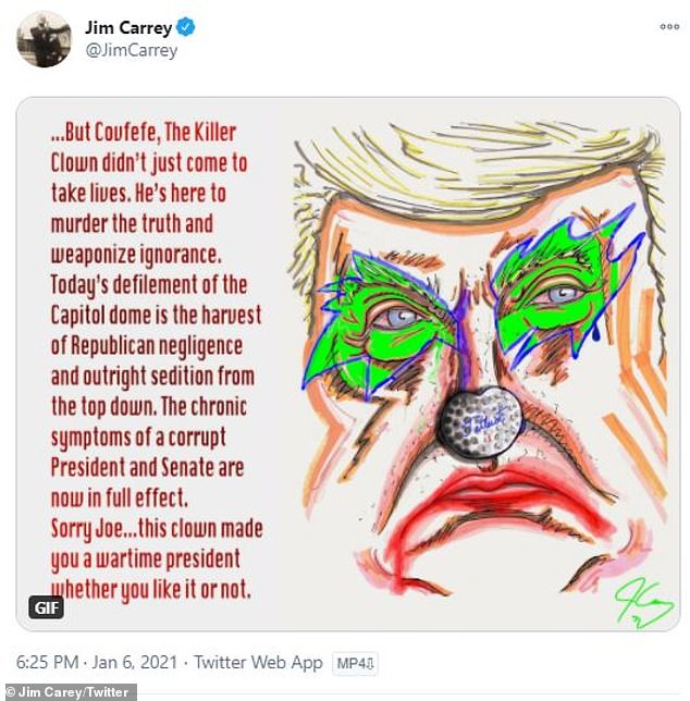 Џим Кери ја искористи својата платформа, но и уметничката способност да ги критикува Доналд Трамп и неговите соработници за, како што напиша, макотрпниот четиригодишен мандат.