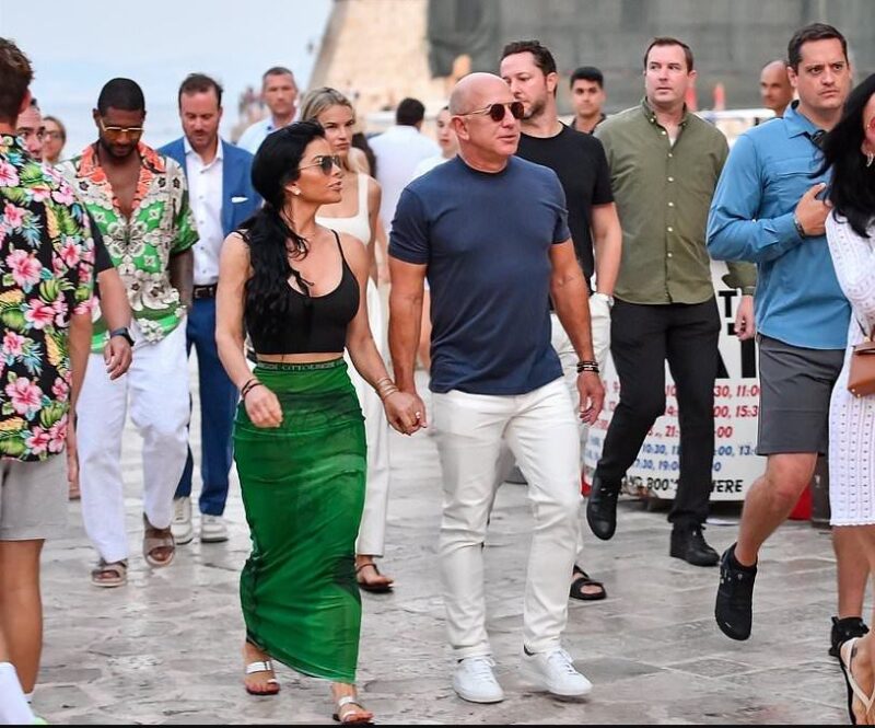 Нејзиниот свршеник (59), основач на „Амазон“, е облечен во бели чино-панталони и темносина маица.
