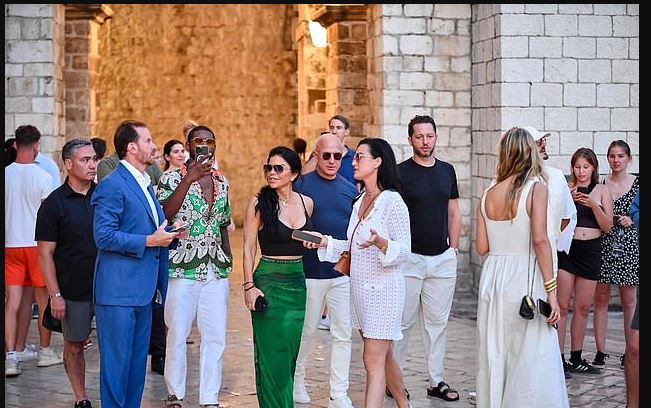 Придружувани од инфлуенсерот Дерек Бласберг и неколку телохранители, кои ги држат љубопитните туристи на растојание, тие се движеа по Страдун – главната пешачка улица, опкружена со ресторани, барови и продавници.