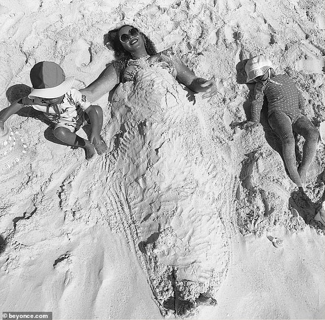 Недостига нејзиниот сопруг Џеј Зи со кого е во брак 12 години, иако тој веројатно ја закопал во песокот бидејќи отпечатоците од рацете се преголеми за да бидат од близнаците.
