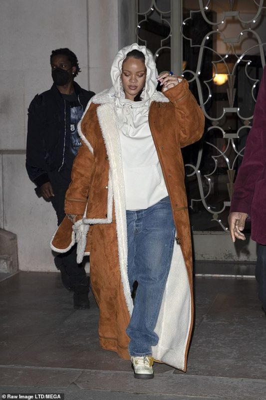 34-годишната Ријана, која го очекува своето прво дете со 33-годишниот рапер, на себе има широк беж дуксер и капут од велур во карамел боја.