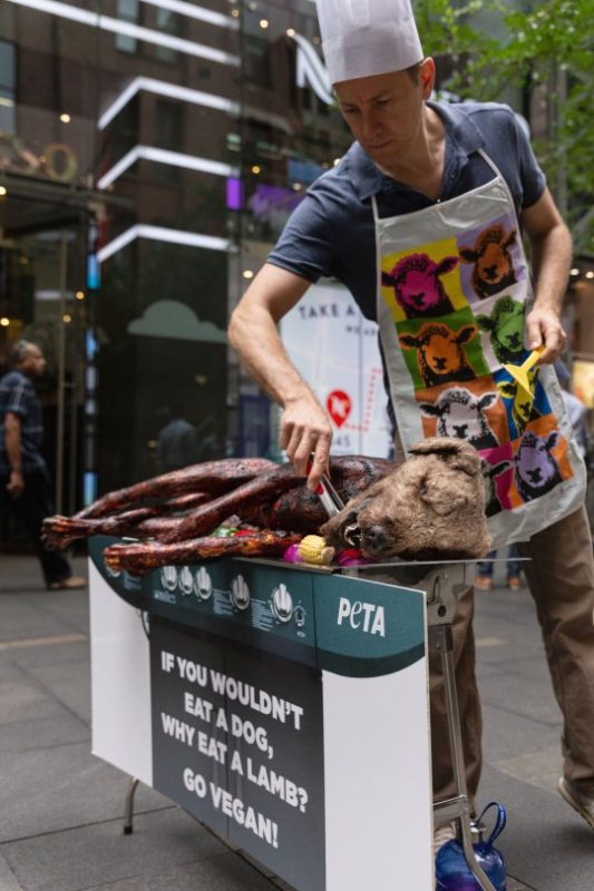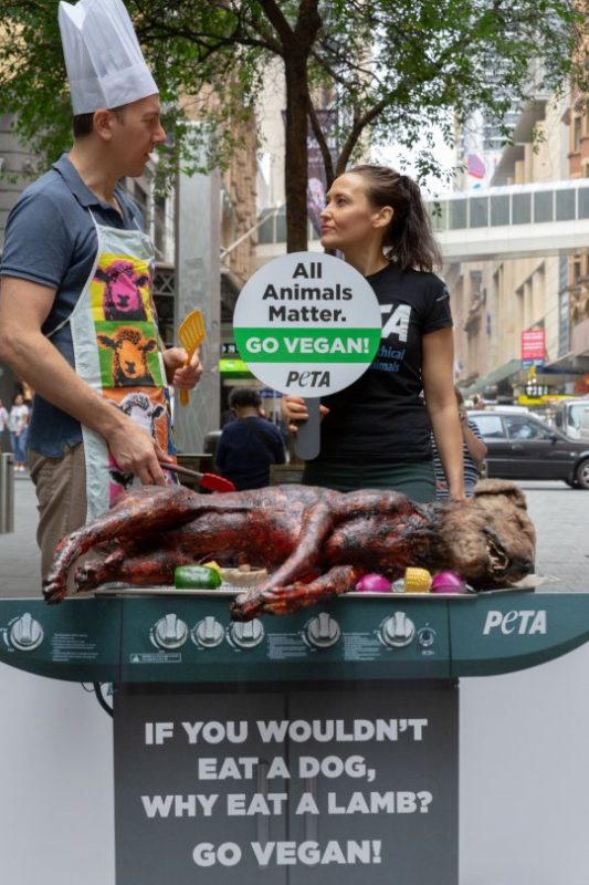 Протестот на ПЕТА, кој вклучуваше реквизит на куче, беше замислен така за да ги натера луѓето да се прашуваат: „Ако не јадете куче, зошто јадете јагне?”