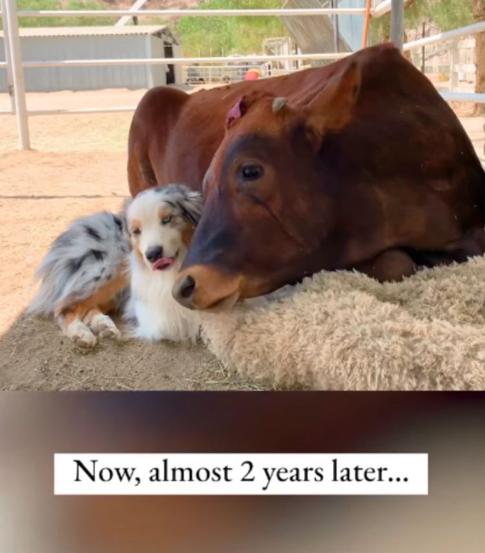 Ова мало теле го испуштило својот прв среќен звук со својот пријател куче, а денес, бик тежок над 450 килограми, мора да легне за да можат безбедно да играат, пренесува „Д’ Додо“.