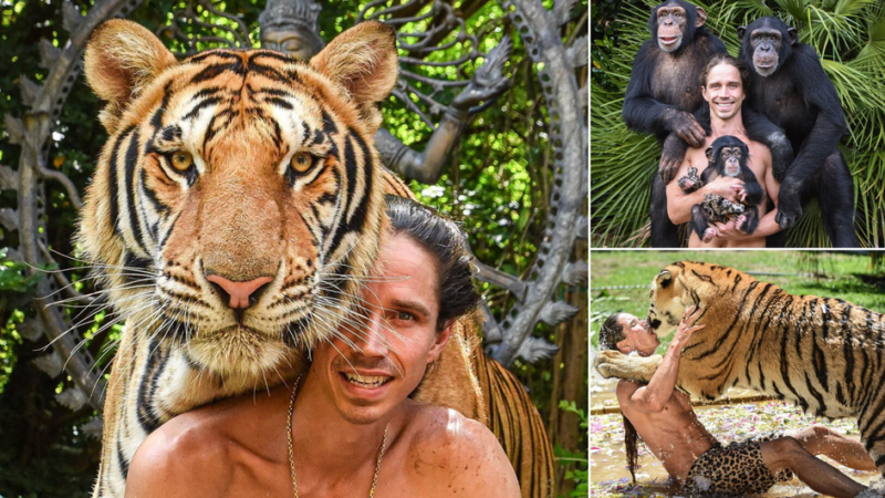 Неговиот профил на Инстаграм е токму спротивното од она што сме навикнати да го гледаме. Тој споделува видеа на хранење тигри, игра со шимпанза и позира со нив.