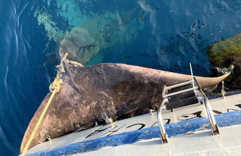 Негови пријатели дошле со дополнителен брод за да го извлечат до пристаништето. Но, тогаш настанала вистинска драма, зошто никој не очекувал дека уловот во мрежата всушност е заштитено морско куче, долго речиси осум метри и тешко околу два тона.