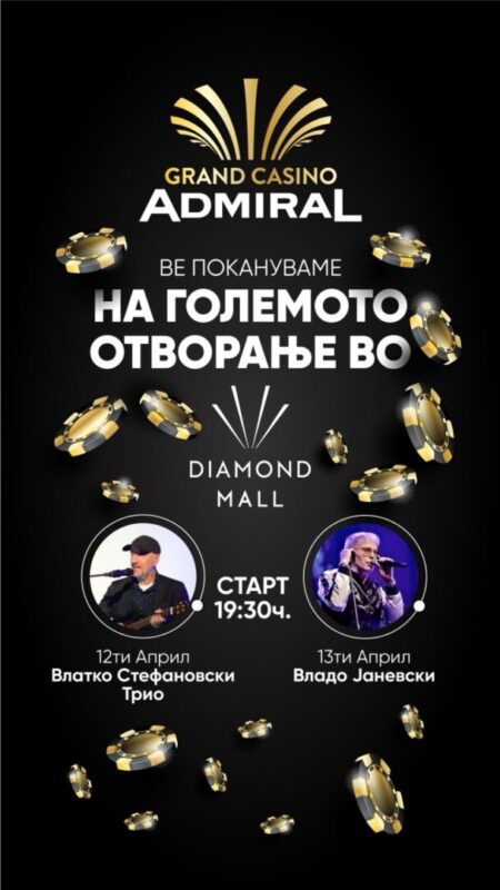„Grand Casino Admiral Ве кани на големото отворање во Diamond Mall со спектакуларни концерти на нашите најпопуларни изведувачи. Дојдете да ги свртиме заедно среќните коцки , и да се забавуваме со легендите на македонската музика. Ви ветуваме квалитетна забава и богата програма со многу изненадувања и наградни ваучери со почеток во 19:30 часот“, најавуваат од казиното.
